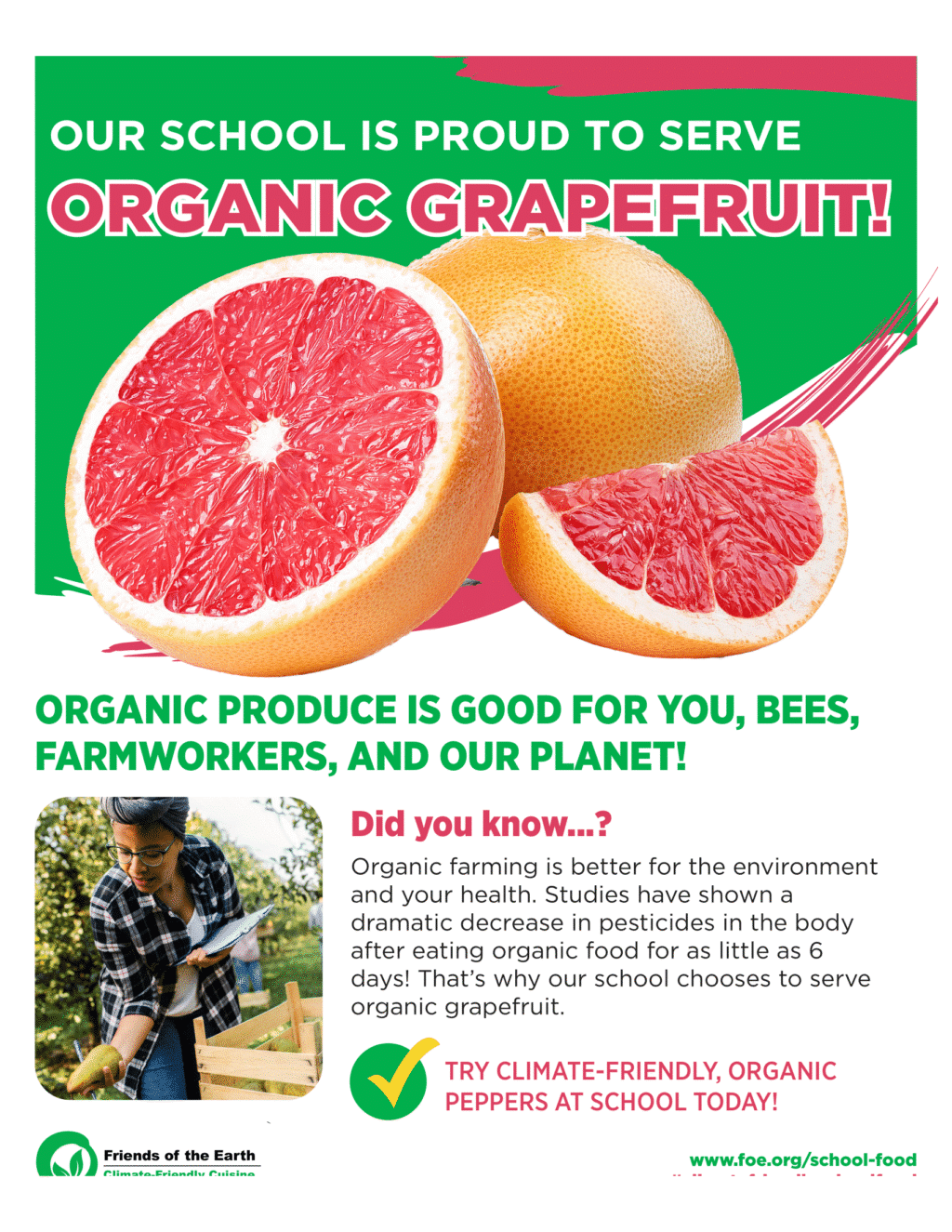 Materiales de marketing orgánico de Amigos de la Tierra, disponibles en inglés y Español, ayudar a informar a los estudiantes, padres y otras partes interesadas sobre los beneficios de comer productos orgánicos.