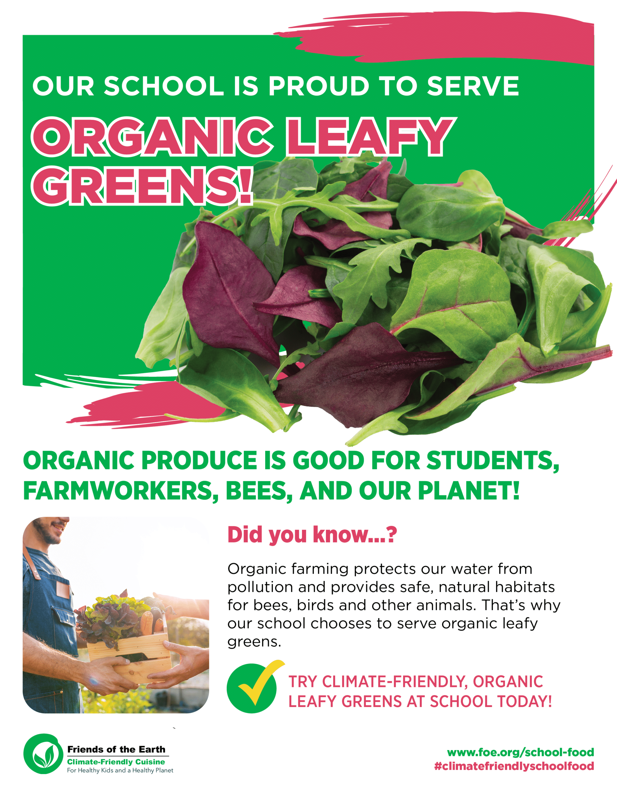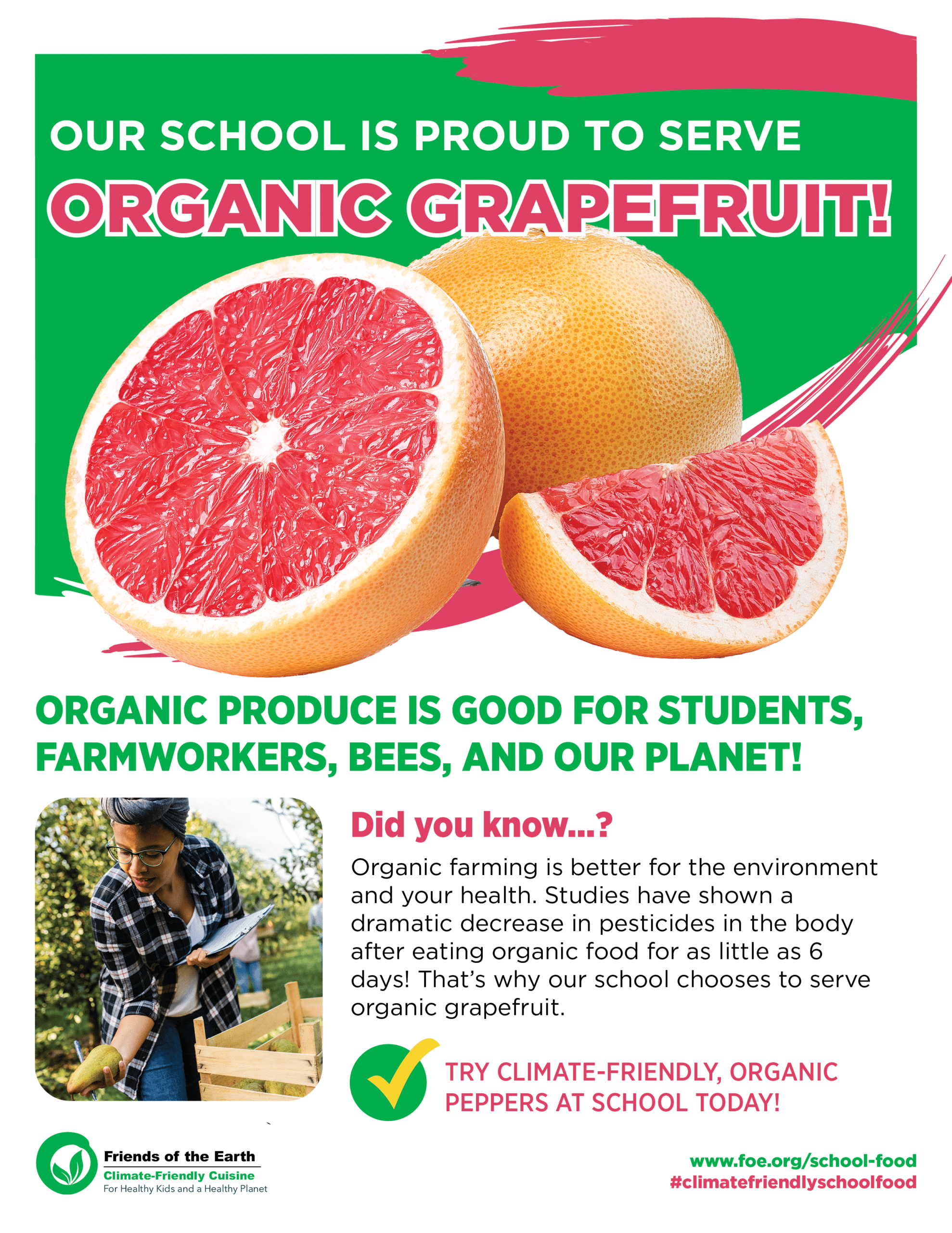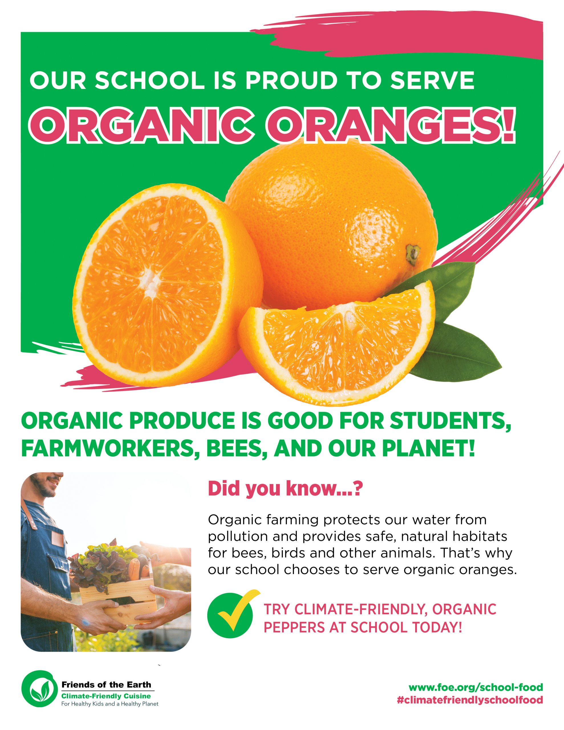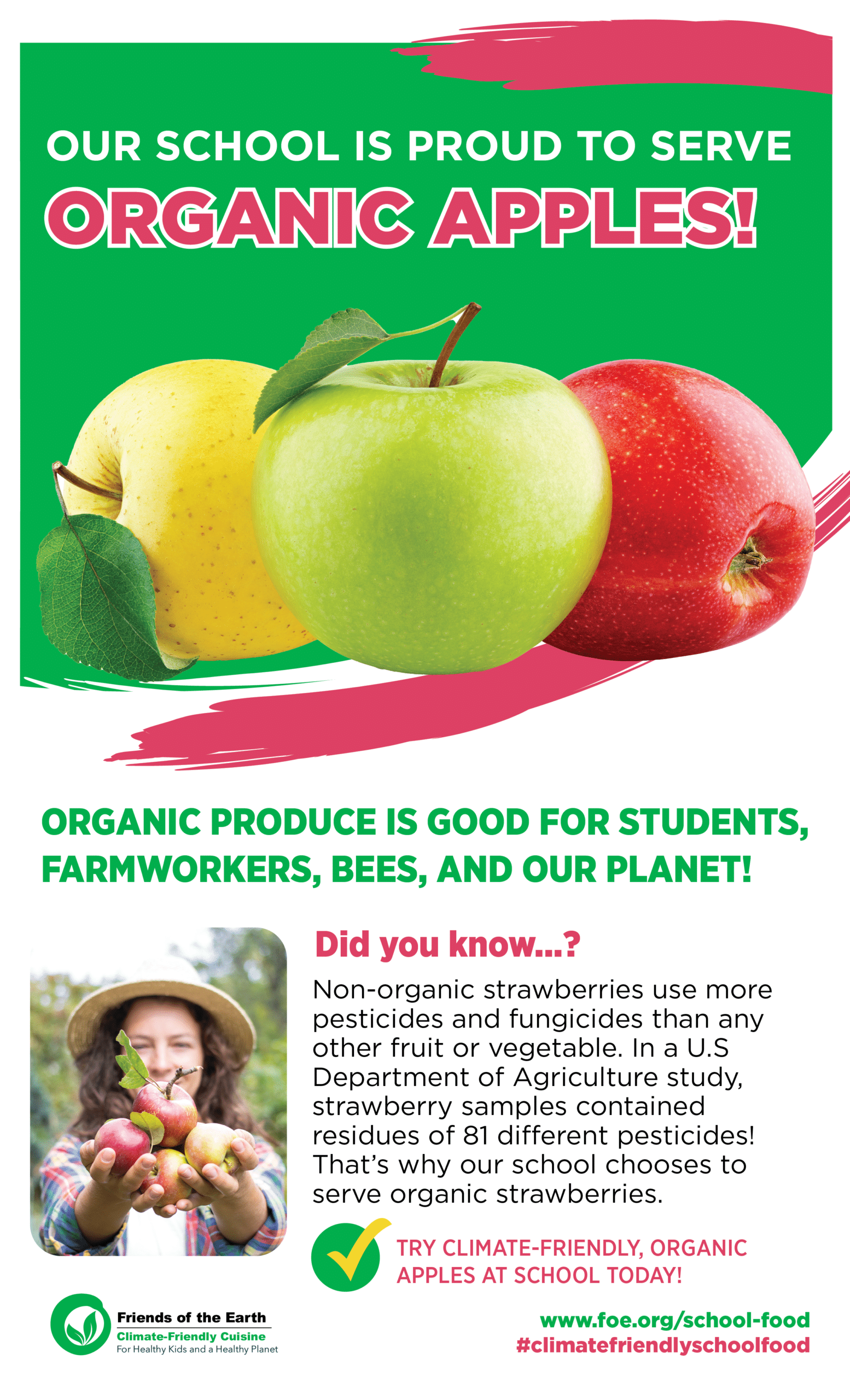 Materiales de marketing orgánico de Amigos de la Tierra, disponibles en inglés y Español, ayudar a informar a los estudiantes, padres y otras partes interesadas sobre los beneficios de comer productos orgánicos.