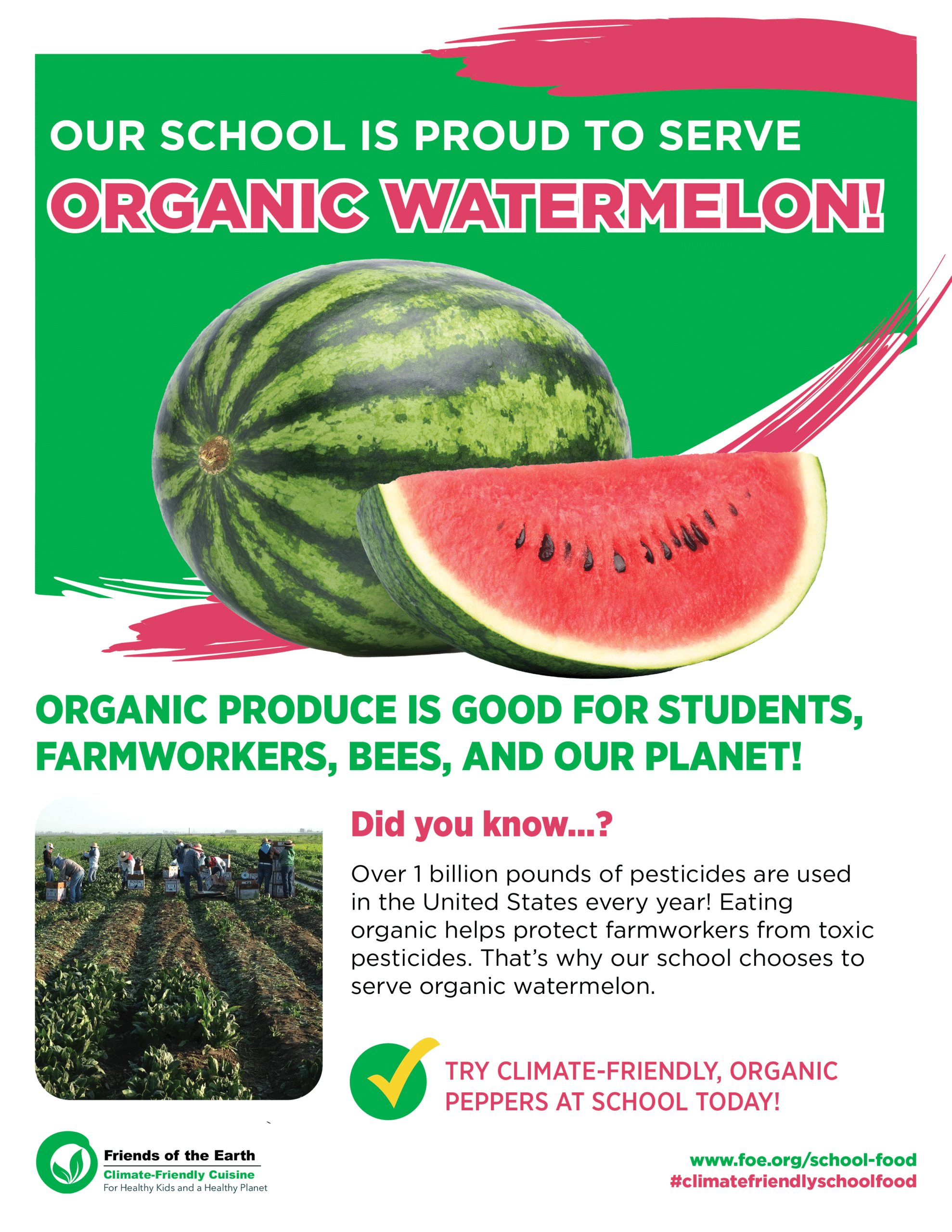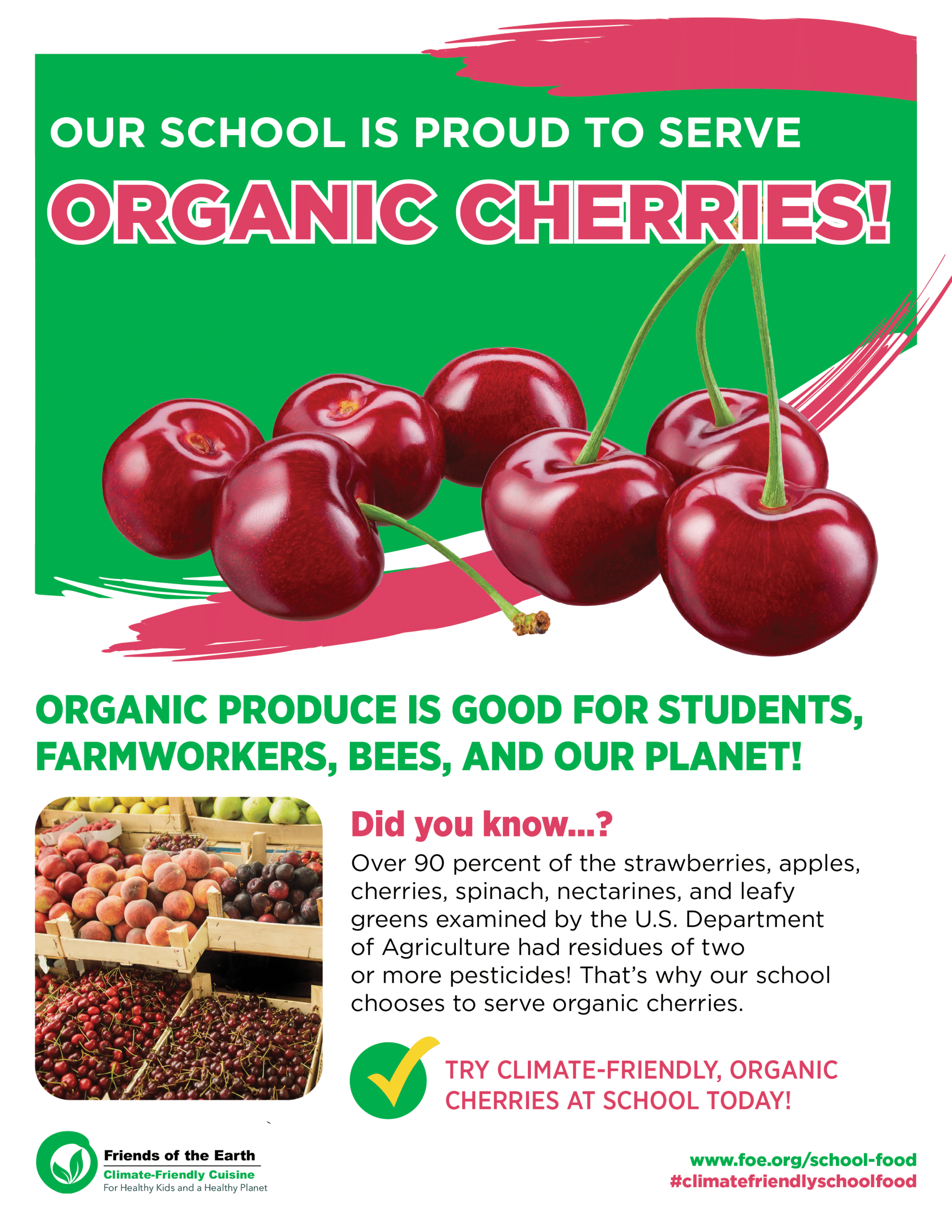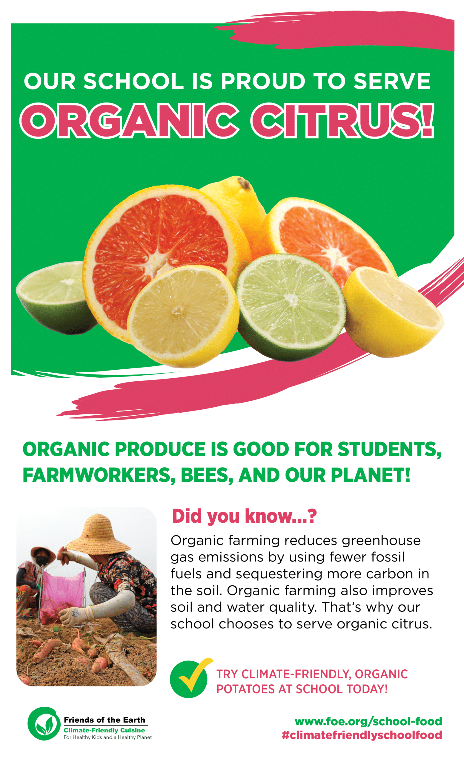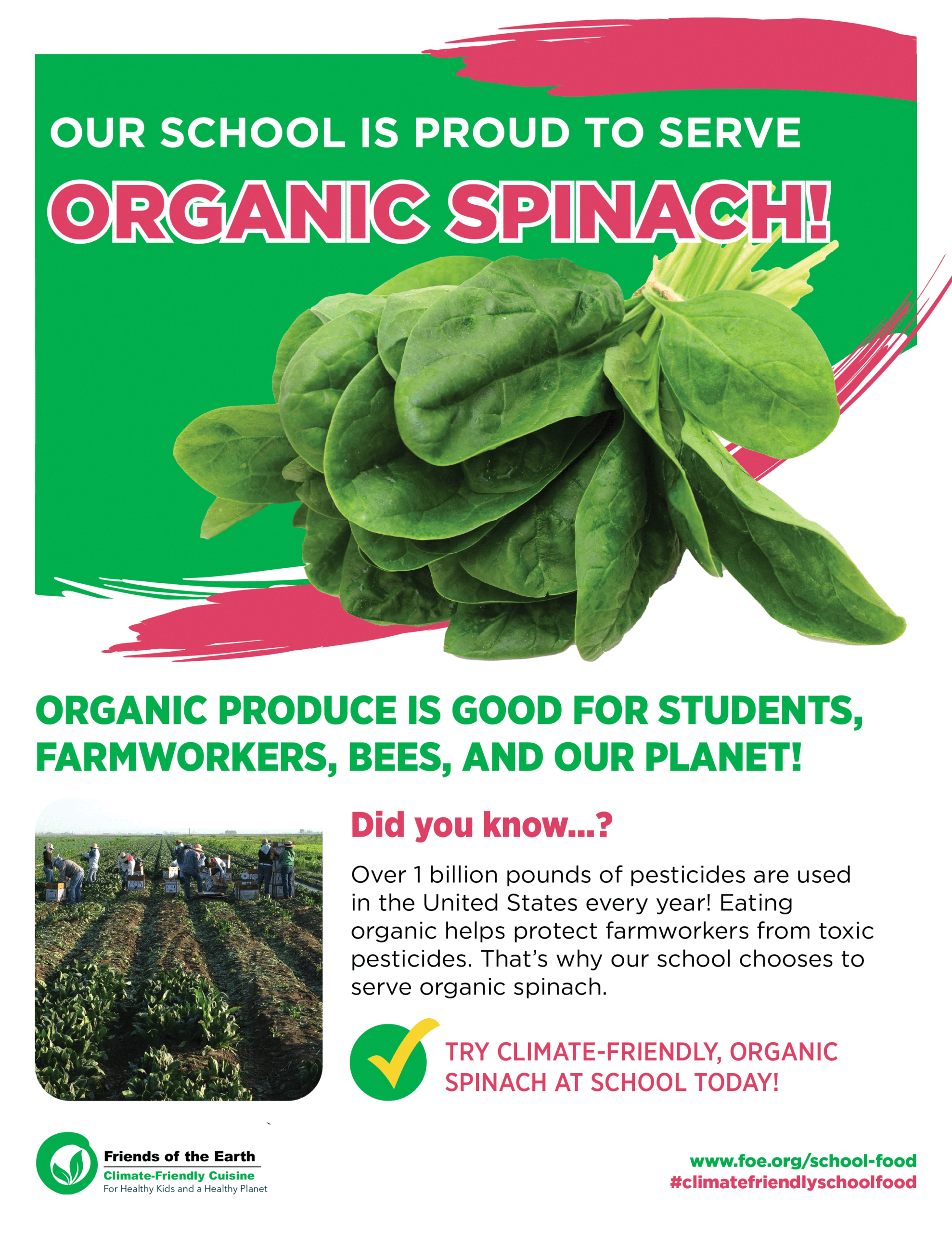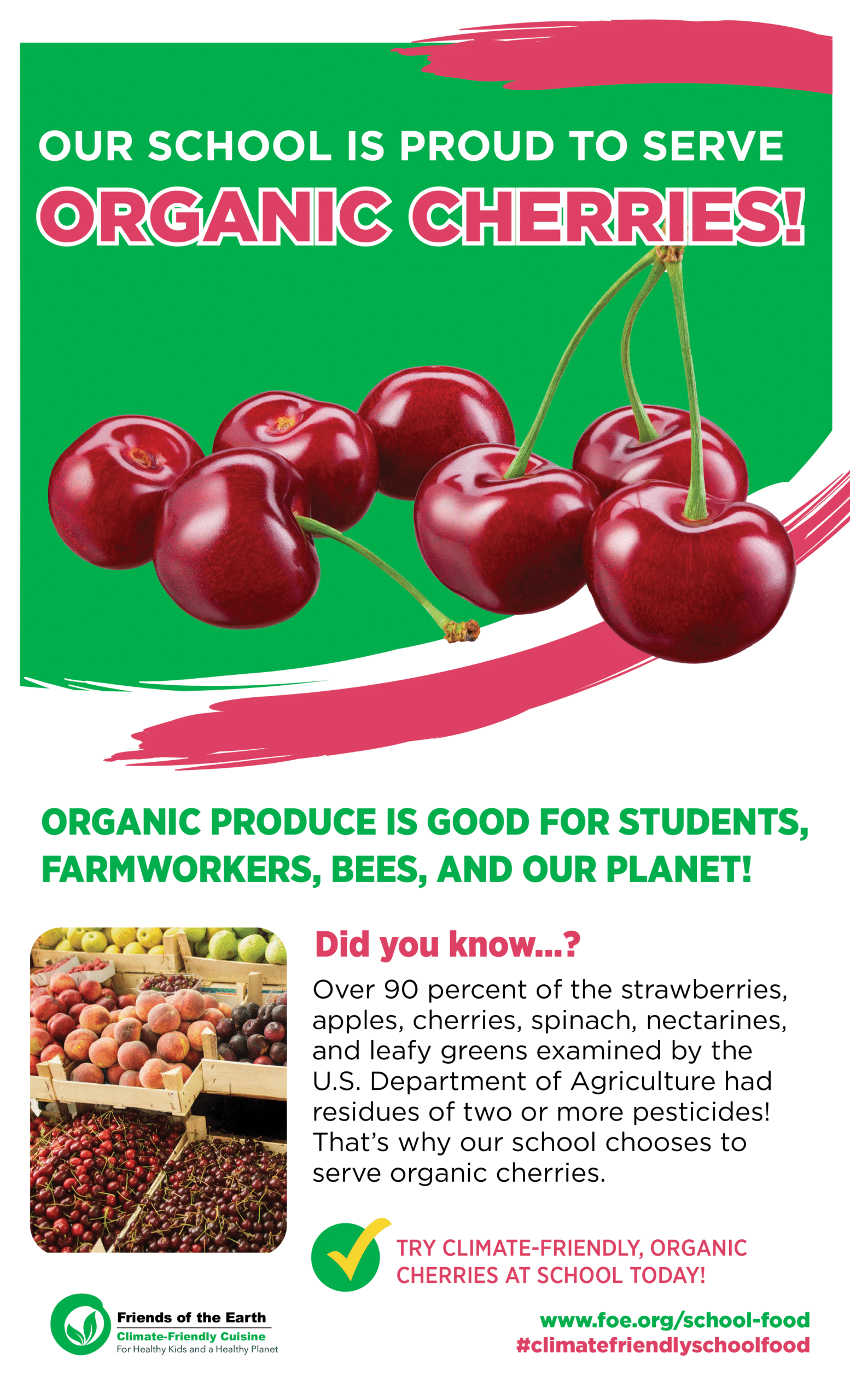 Materiales de marketing orgánico de Amigos de la Tierra, disponibles en inglés y Español, ayudar a informar a los estudiantes, padres y otras partes interesadas sobre los beneficios de comer productos orgánicos.