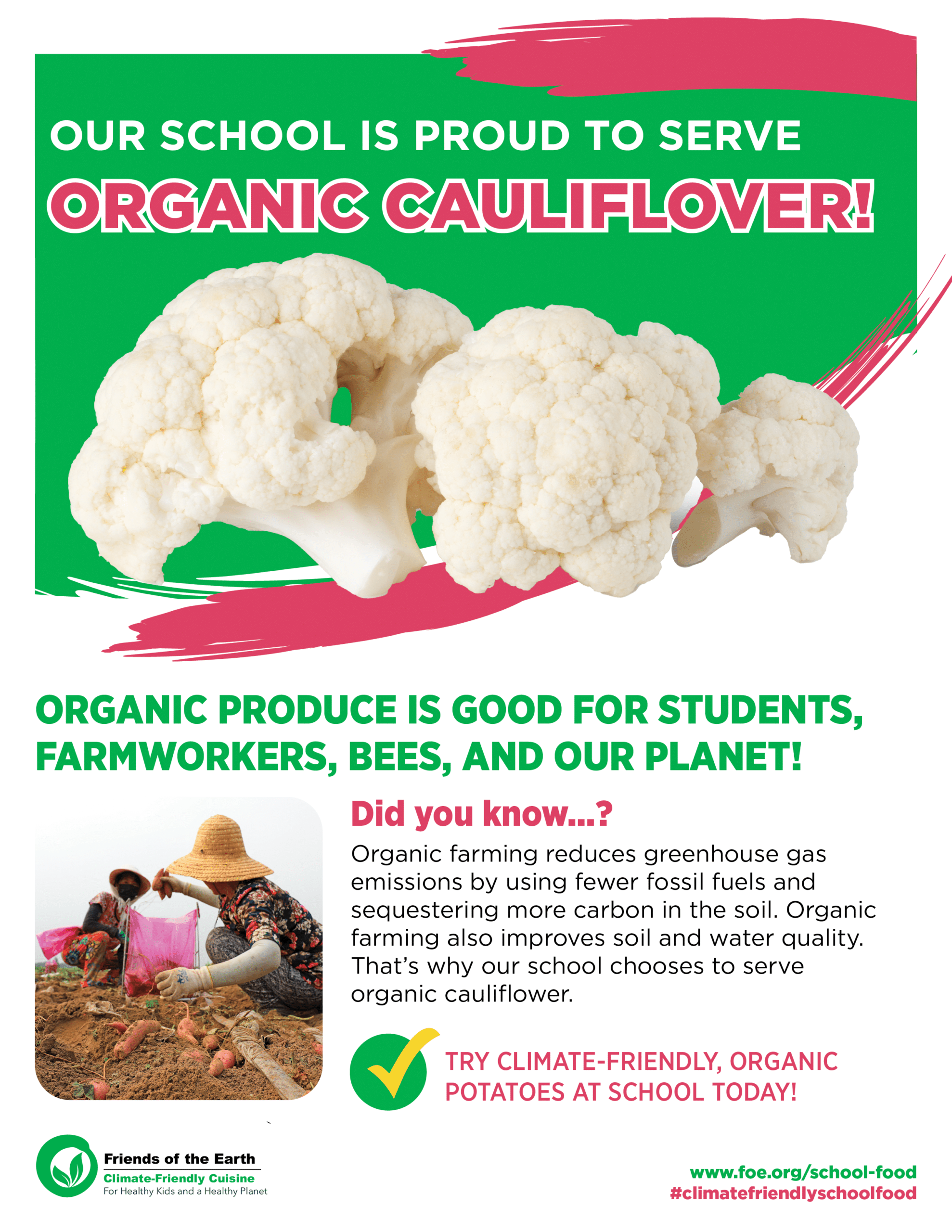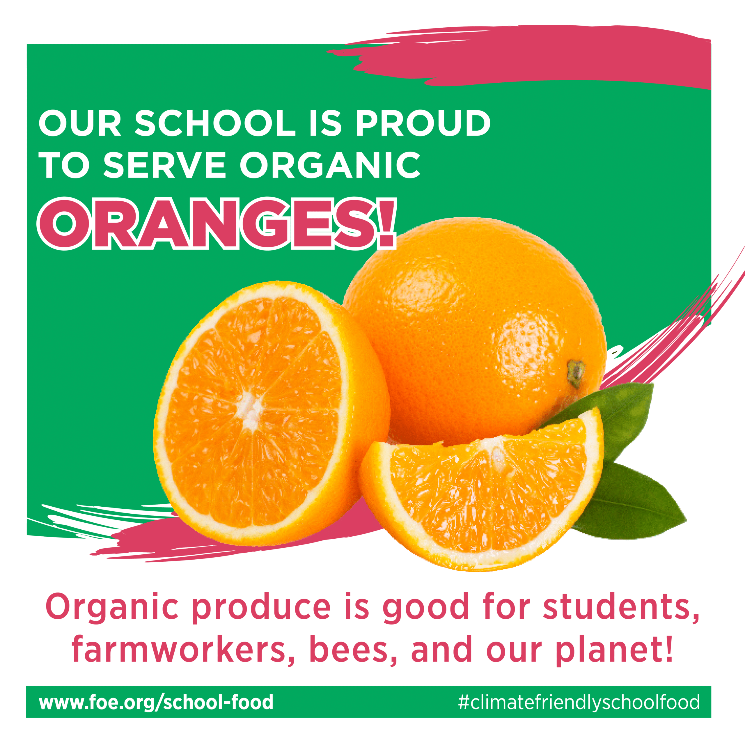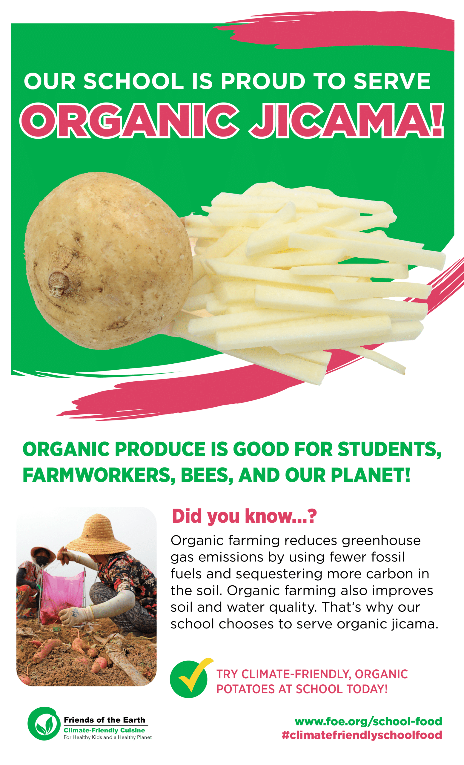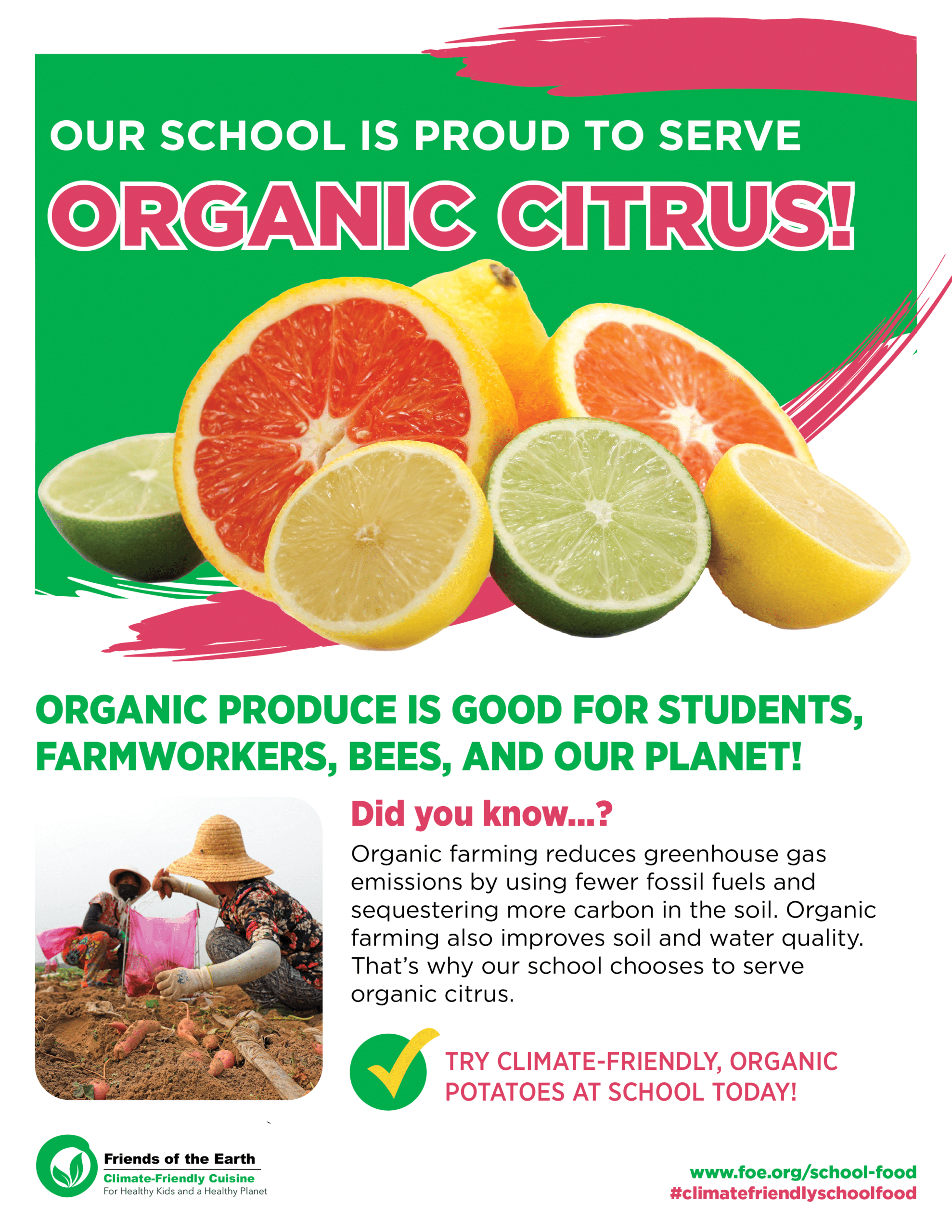 Materiales de marketing orgánico de Amigos de la Tierra, disponibles en inglés y Español, ayudar a informar a los estudiantes, padres y otras partes interesadas sobre los beneficios de comer productos orgánicos.