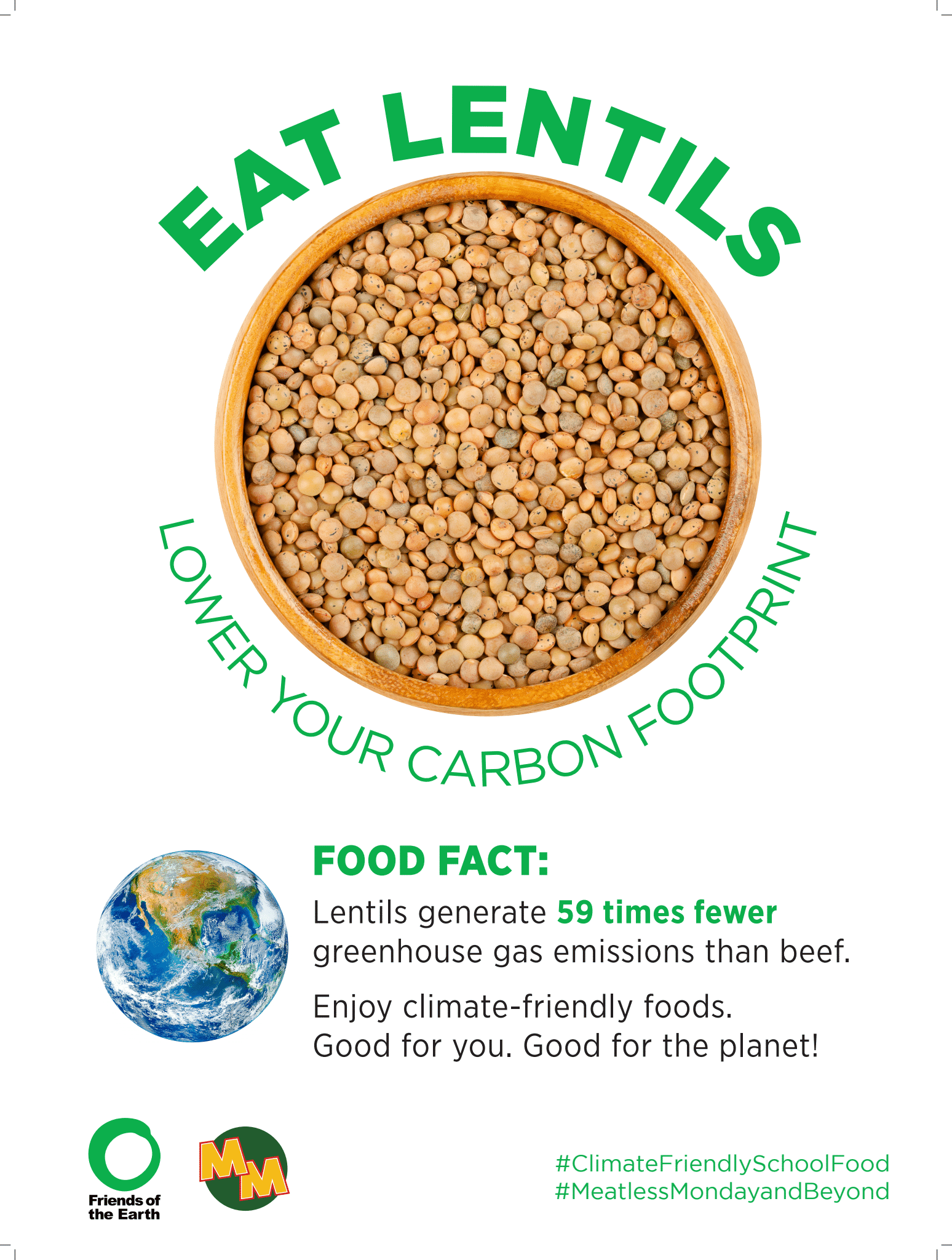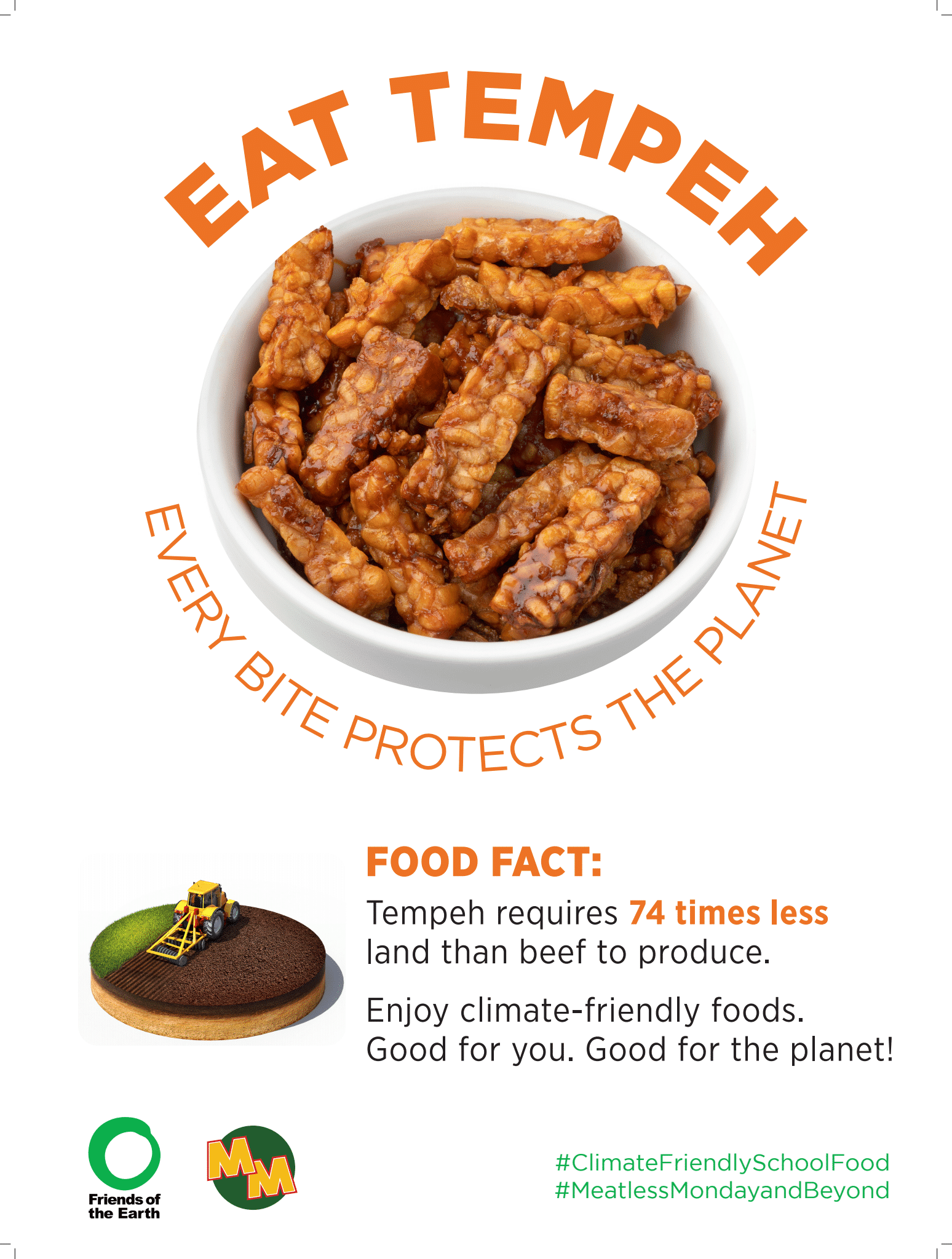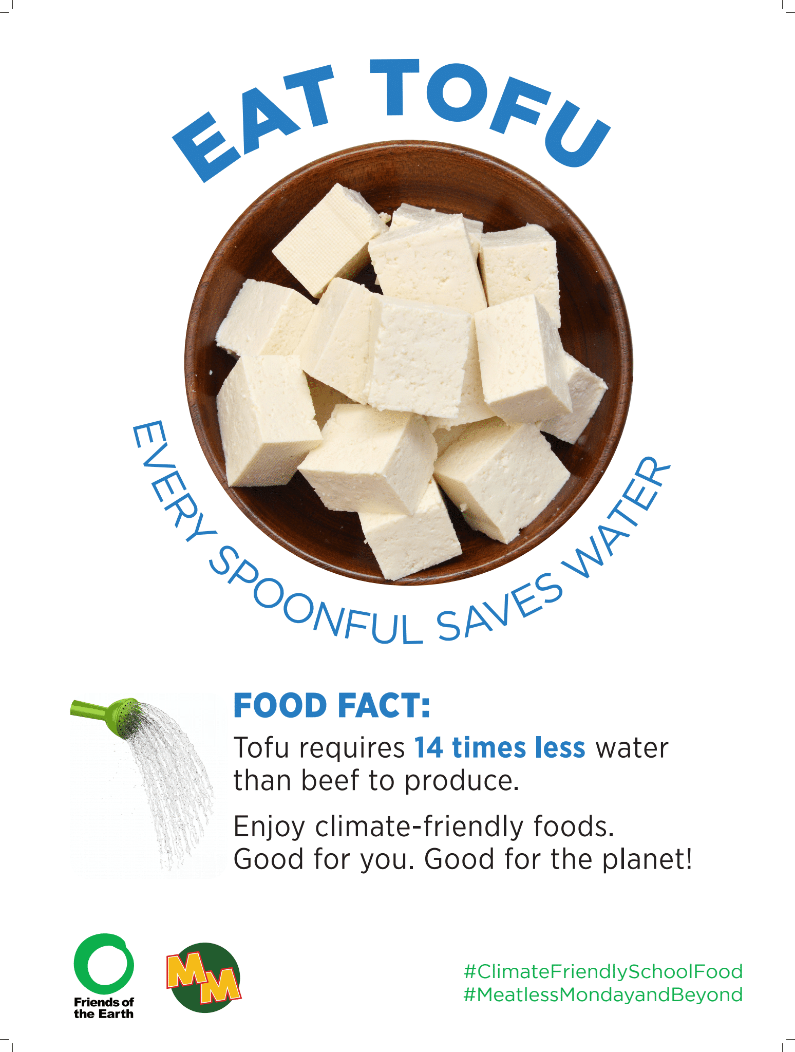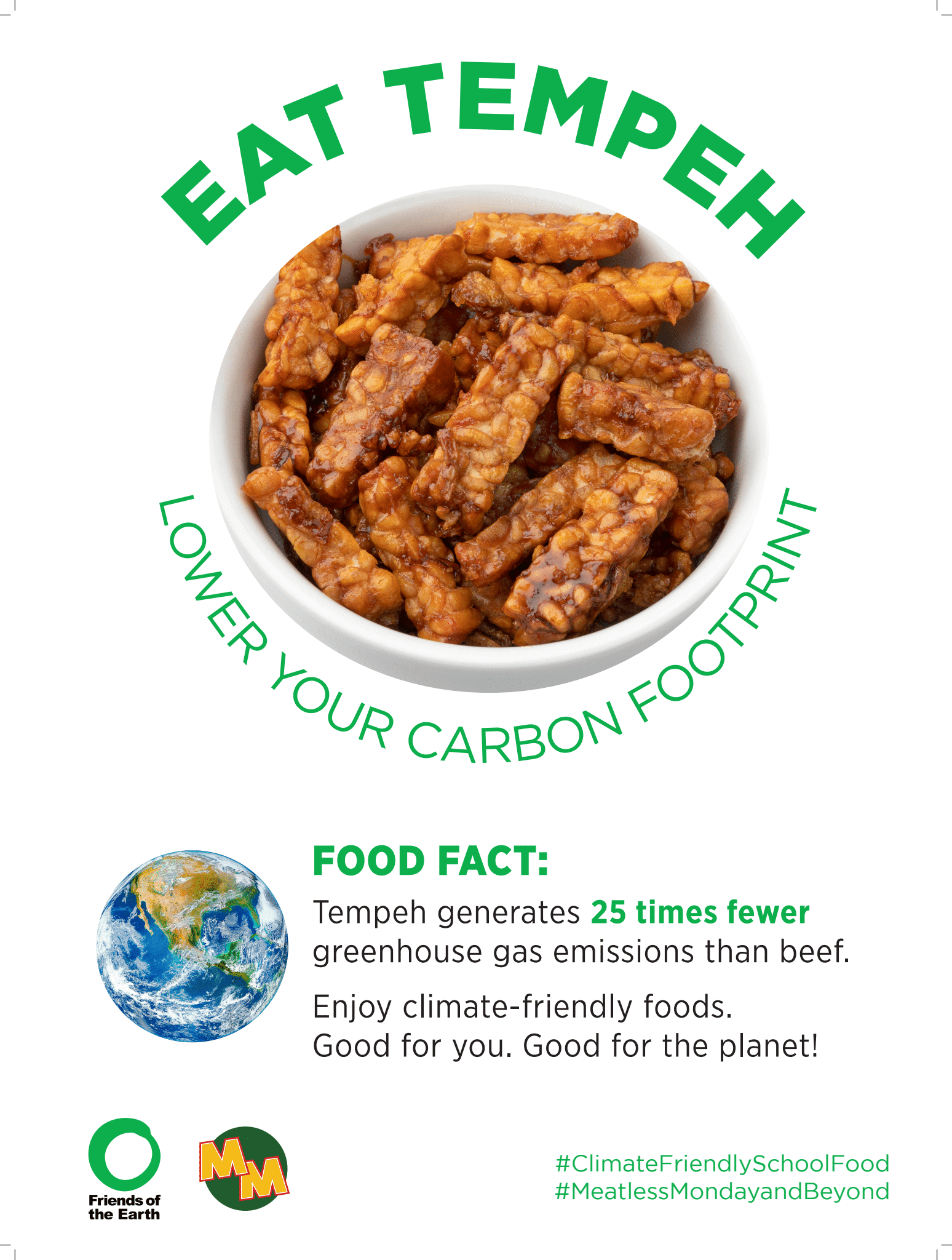 Materiales de marketing de base vegetal de Amigos de la Tierra, disponibles en inglés y Español, ayudar a promover opciones basadas en plantas en la cafetería e involucrar a los estudiantes con contenido divertido y educativo sobre alimentos básicos nutritivos como el tofu y las lentejas.