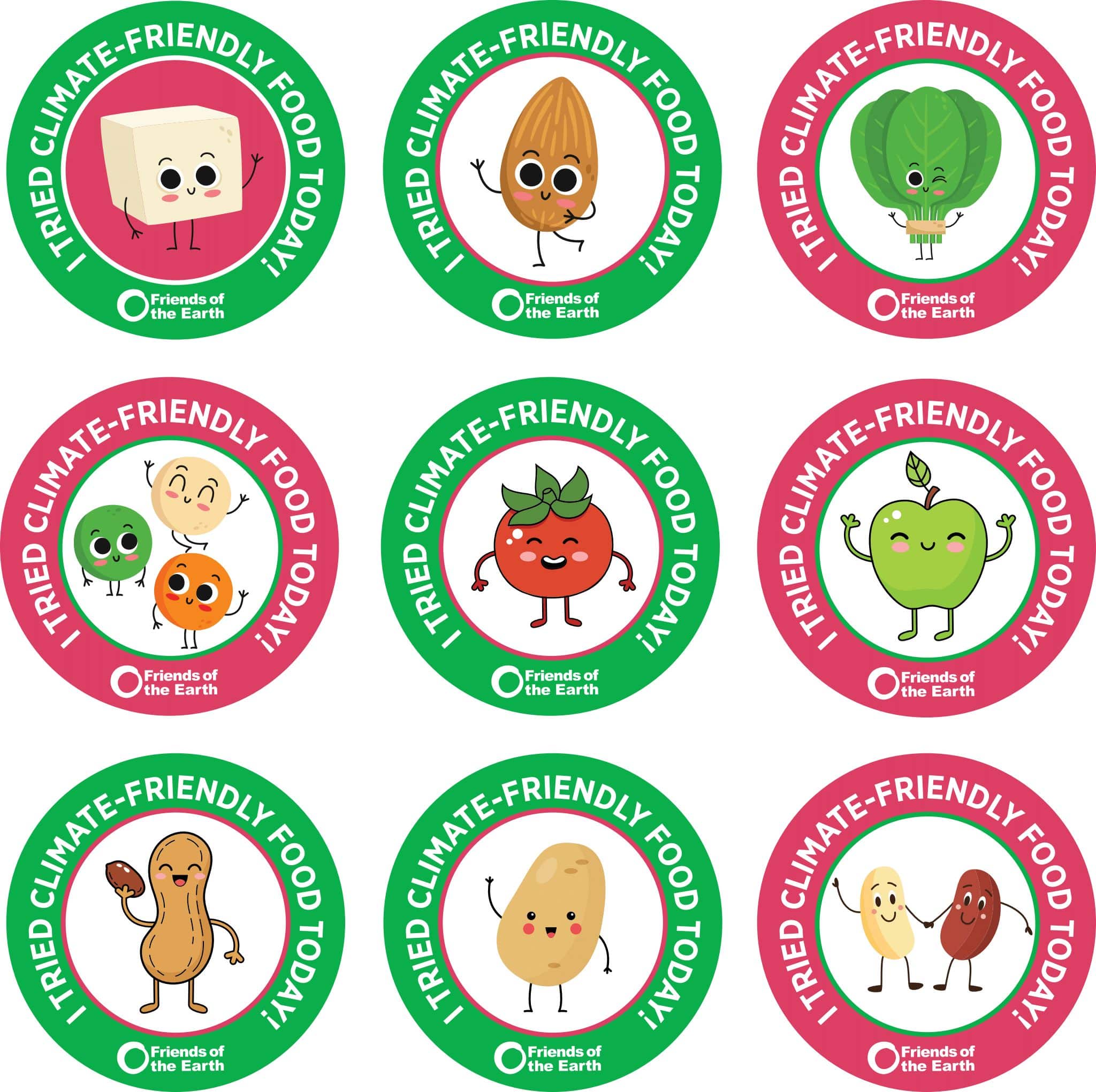 Las pegatinas "Lo probé" (7,6 x 7,6 cm) son muy populares entre los estudiantes. Estas pegatinas de 7,6 x 7,6 cm están diseñadas para compartir con los estudiantes más jóvenes durante las catas, mientras prueban nuevos alimentos. Las pegatinas circulares presentan nueve alimentos nutritivos como tofu, espinacas, lentejas y frijoles, y la leyenda "Probé alimentos respetuosos con el medio ambiente".“