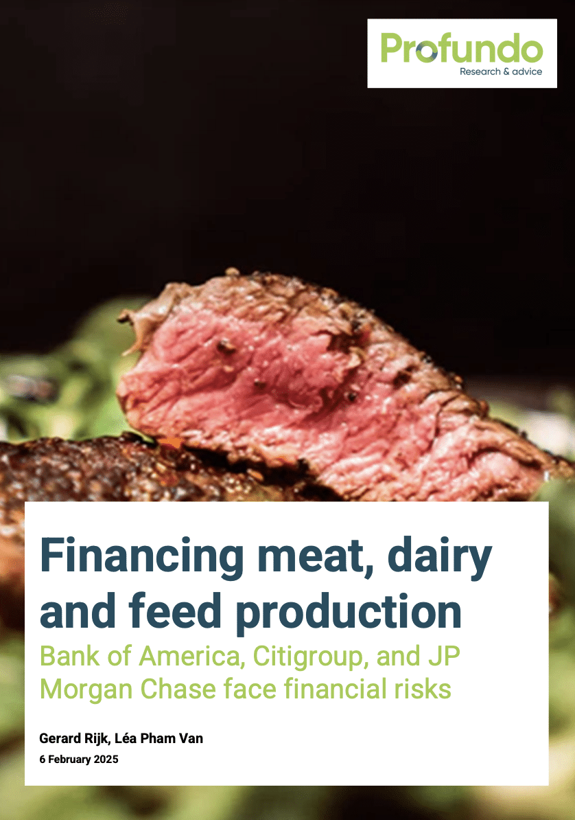 According to a June 2024 analysis by Profundo and Friends of the Earth U.S., BofA, Citi and JPMC (the “Big Three”) provided, arranged, or issued US$ 74B in financing and underwriting to 29 of the world’s largest meat, dairy and feed corporations between 2016 and 2023. While this financing constituted a minor fraction of the banks’ overall financing, it had a major impact on the banks’ financed emissions. The Big Three’s lending to 29 corporations represented just 0.25% of the banks’ total loans outstanding but roughly 11% of their reported financed emissions. According to this new analysis by Profundo, climate-related losses to the Big Three’s meat, dairy and feed clients could put 90% of the banks’ current financing at risk.