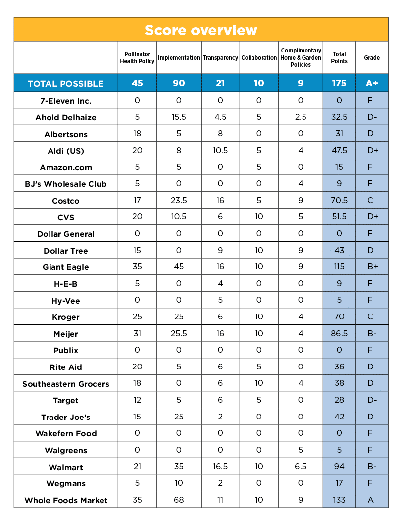 We looked at whether companies are setting goals to reduce use of pesticides of concern in their food and beverage supply chains, what they are doing to increase organic offerings and whether they are taking steps to support non-organic farmers to shift to least-toxic, bee-friendly approaches like integrated pest management and regenerative agriculture. We also looked at whether they are educating consumers about these issues and if they are using their power to advocate for public policies that shift government support from pesticide-intensive agriculture to organic and ecological farming systems. Additional points were awarded for complimentary policies in home and garden supply chains.