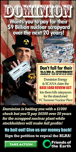 COLUMBIA, SC – Mientras la legislatura de Carolina del Sur se encuentra en medio de un debate muy intenso sobre el destino de la legislación relativa al fallido proyecto de construcción del reactor nuclear VC Summer, Amigos de la Tierra inició esta semana una campaña publicitaria Alentando al público a tomar medidas contra cualquier rescate financiado por los contribuyentes.